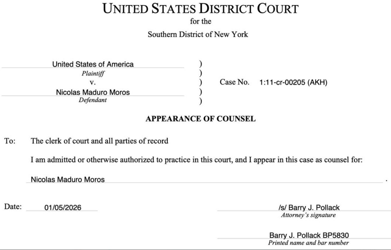 El Diario Tricolor.- Nicolás Maduro designó al abogado estadounidense Barry Pollack para asumir su defensa en el caso de narcotráfico que se sigue en el Distrito Sur de Nueva York. Pollack presentó la notificación oficial de comparecencia como letrado de Maduro antes de la primera audiencia, programada para el mediodía.