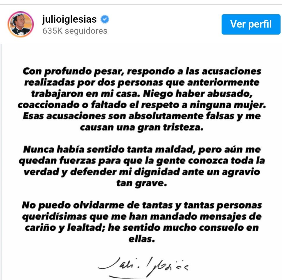 El Diario Tricolor.- Julio Iglesias emitió un comunicado en su cuenta de Instagram, poco después de la 1:00 a.m. (hora española), para desmentir las gravísimas acusaciones de agresión sexual formuladas por dos exempleadas domésticas.