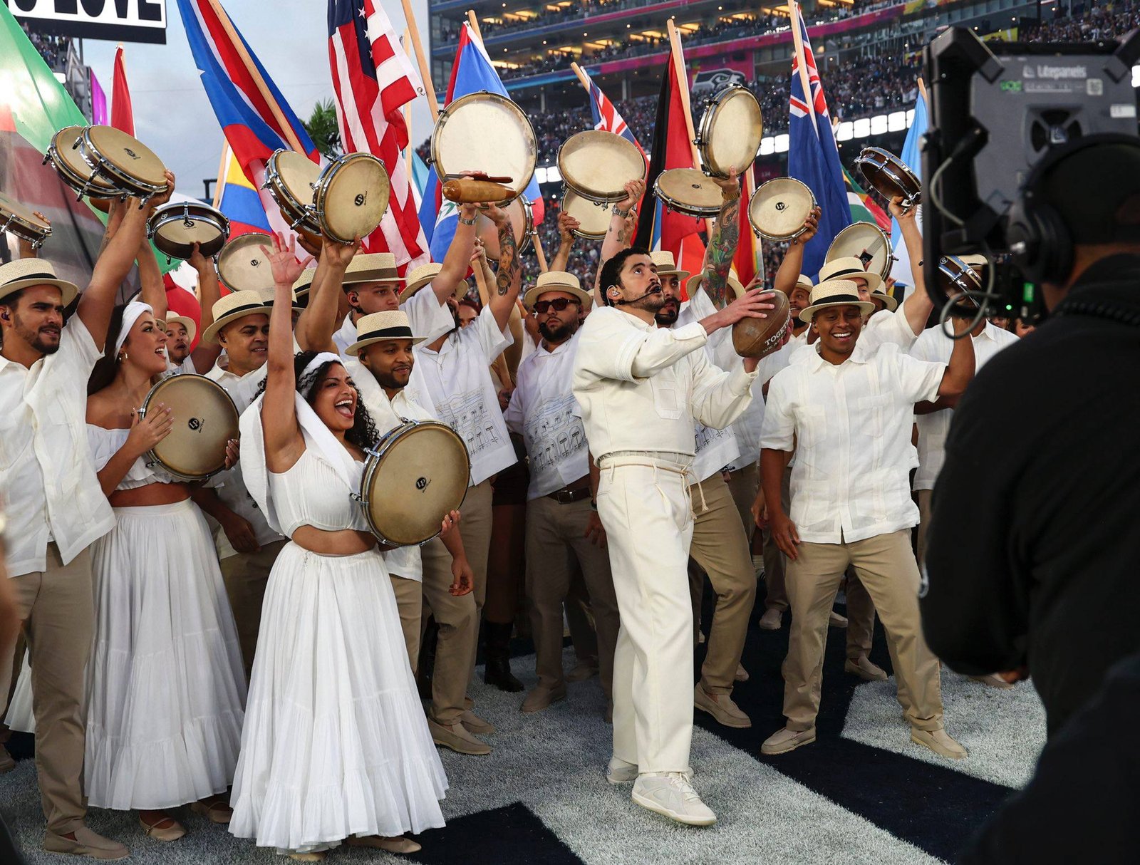Otro de los puntos focales de su interpretación fue el balón de fútbol americano que mostró a la cámara. Tenía la frase “Juntos somos América”, escrita en inglés y expuesta en respuesta a la frase “América primero” de la administración estadounidense.