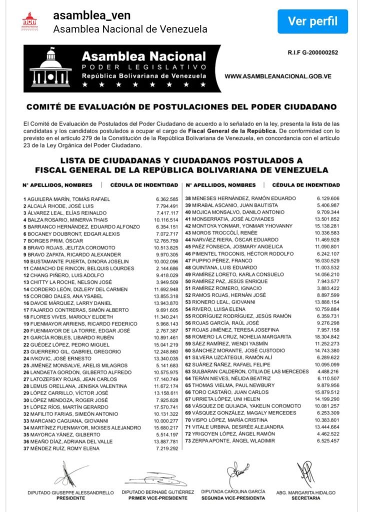 El Diario Tricolor.- Tras el cierre del proceso de recepción de credenciales el viernes pasado, el Comité de Evaluación de Postulados del Poder Ciudadano, de acuerdo a lo señalado en la ley, presentó este lunes 16 de marzo la lista de las candidatas y los candidatos postulados a ocupar los cargos de Fiscal General de la República y Defensor del Pueblo.