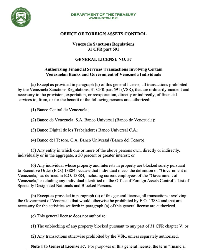 Las licencias generales 56 y 57 permiten a empresas e instituciones realizar negociaciones contractuales y transacciones financieras con organismos vinculados al Estado venezolano, incluyendo bancos públicos como el Banco Central de Venezuela y otras entidades del sistema financiero.